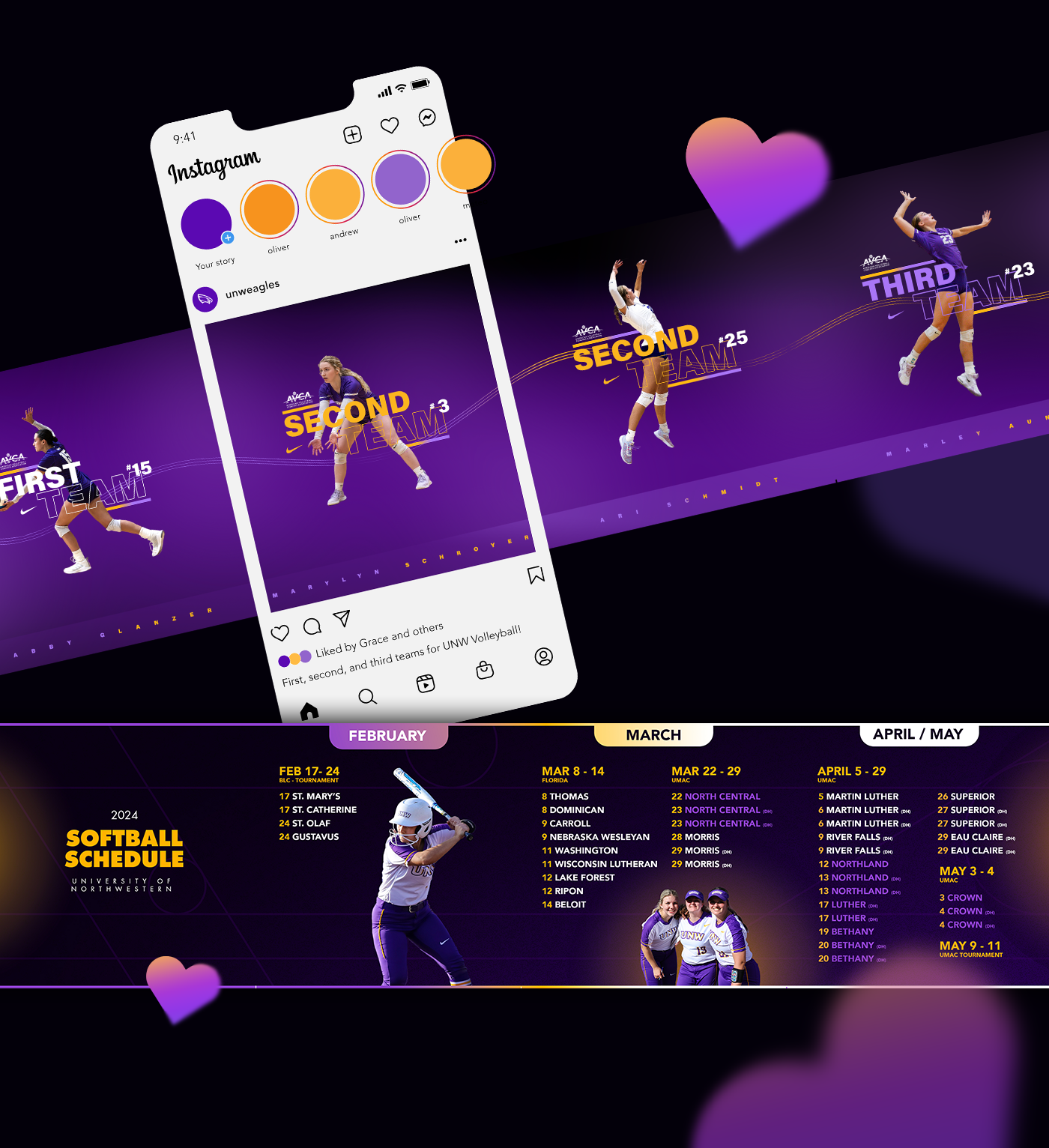 During my junior and senior years at the University of Northwestern–St. Paul, I contributed to developing a refreshed brand identity for the athletic program. My role evolved to lead all creative direction, overseeing the design of social media graphics, apparel, banners, and other key visual assets to ensure a cohesive and engaging brand presence.
